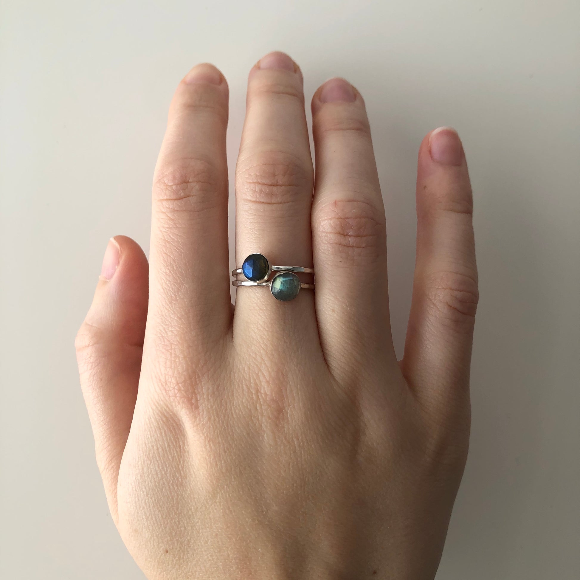 Obsessed with these rings. Originally bought pearl/ gold. Wanted a silver color way and selected the Labradorite. Thought I would wear separately but pair as a stack more often than not! Love the inclusive ring sizing!