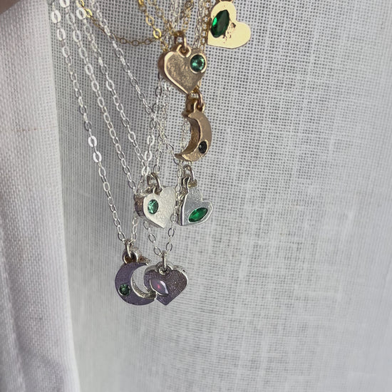 One of a kind lucky charm necklaces featuring cast bronze hearts or moons with embedded lab-grown gemstones.