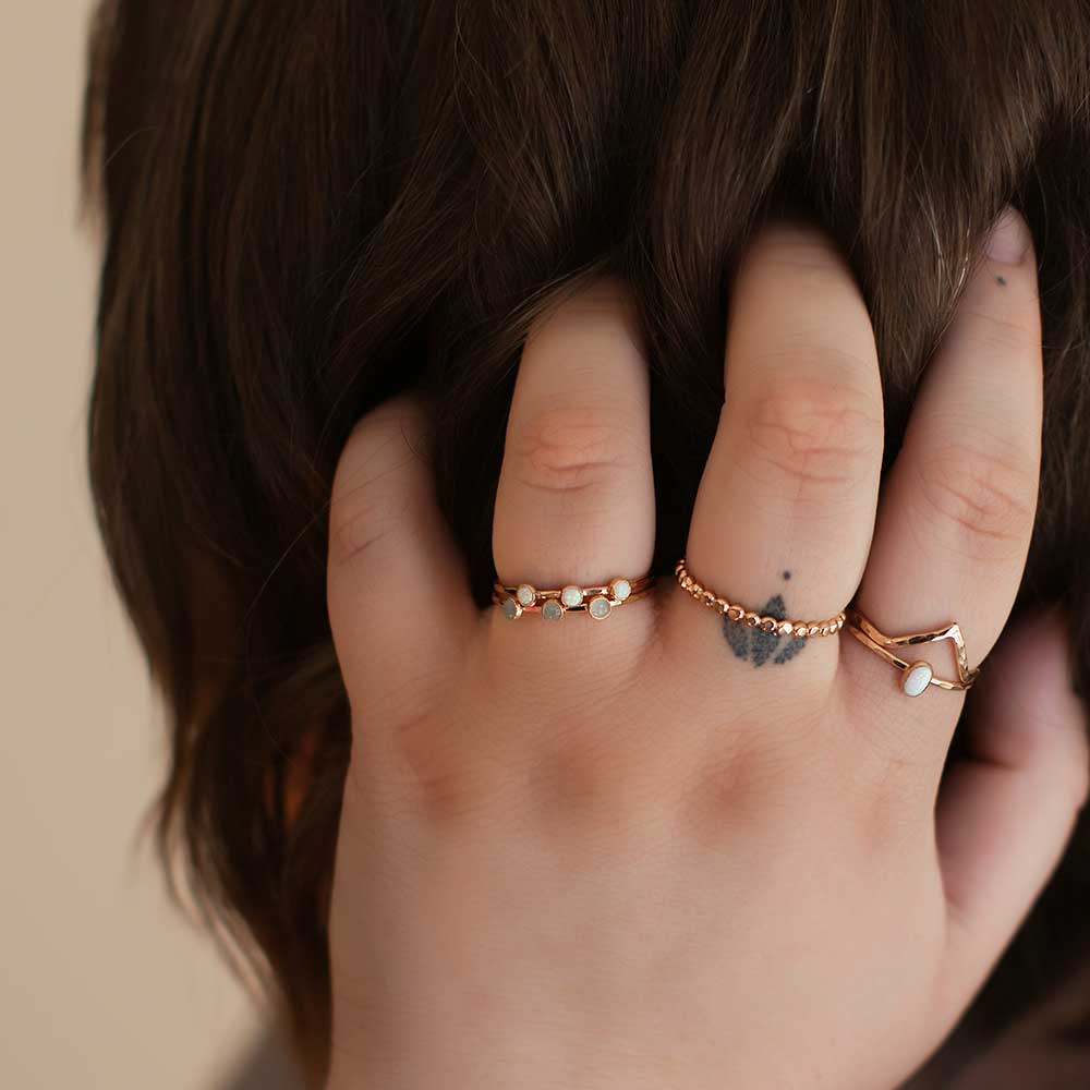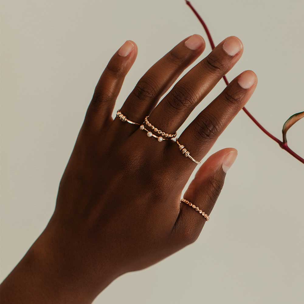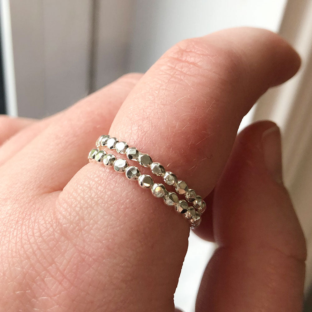 Our prism stacking ring is a reflective delight. Hand-textured orbs cast light in all directions, creating a sparkling ring you can effortlessly stack with anything in your jewelry box. Thicker than our standard stackers.