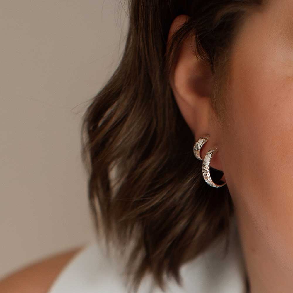 Our flora hoop earrings are the perfect balance of delicate and statement. Featuring a vintage-inspired botanical motif, these wide hoops come in two sizes and are the perfect way to adorn your ears.