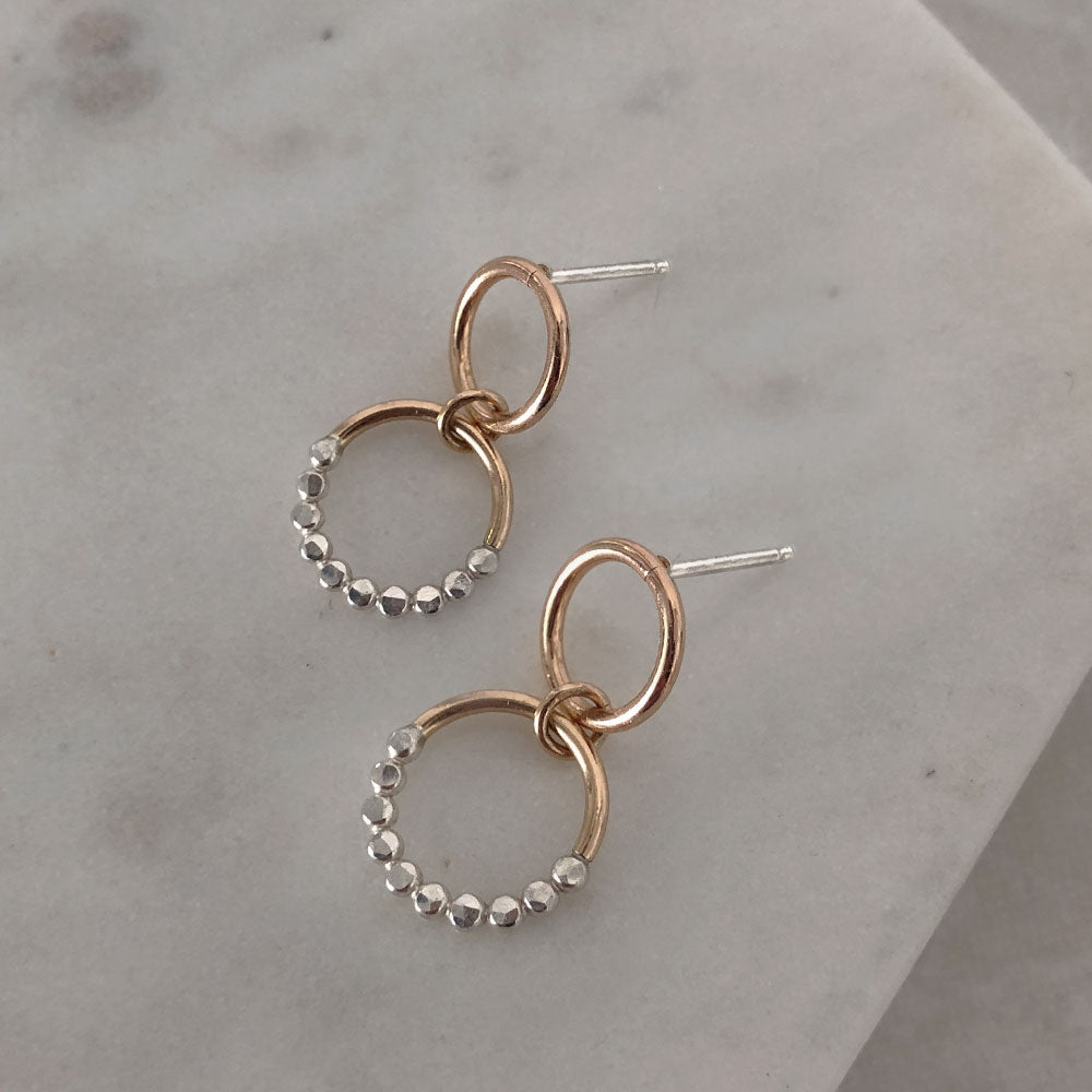 Our mixed-metal Prism Circle Drop earrings are sleek, sophisticated and sparkle like crazy. Hand-textured orbs in sterling silver give the illusion of pave diamonds, and cast light in all directions.